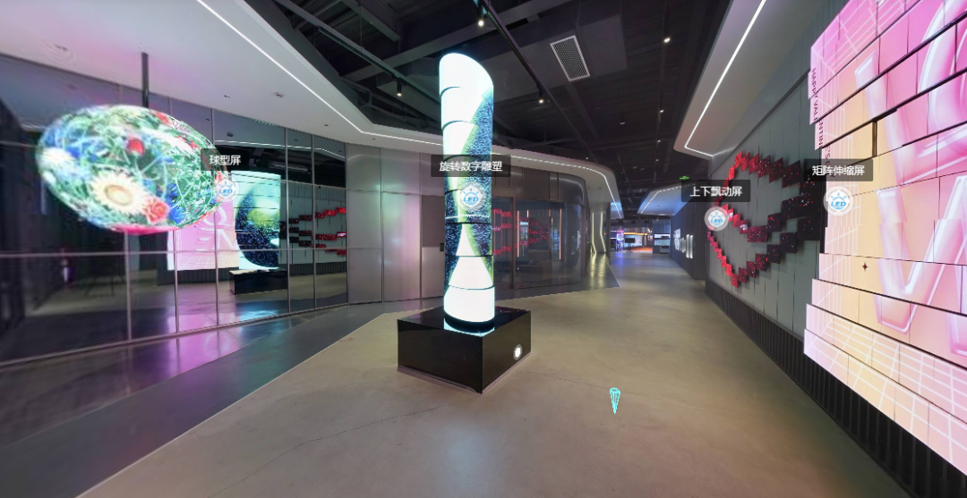观众可以第一视角沉浸式漫游体验展厅场景,身临其境的感受展厅环境,查看展项与展品。虚拟展厅内所有展项、展品均进行了名称标注,且集成产品资料、方案、案例、视频介绍等内容,观众可点击查看,自助参观。