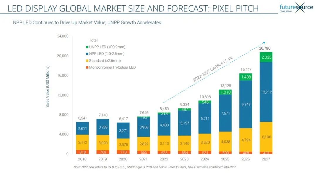 Futuresource报告显示,2022年全球LED显示市场达到85亿美元,与2021年相比增长了10.6%Futuresource预计2023年全球LED市场的收入将增长10.2%,达到93亿美元。五年预测显示,到2027年,复合年增长率(CAGR)将达到17.4%,市场规模将增至208亿美元。金沙990作为国家制造业单项冠军,对显示行业未来发展充满信心。